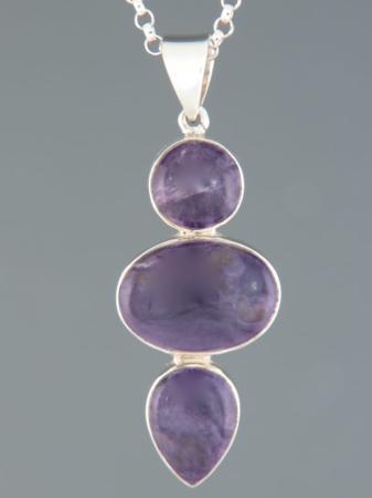 This Sterling Silver pendant features round, oval and teardrop Charoite cabochons.