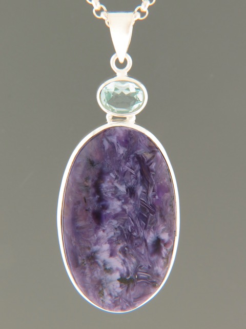 This Sterling Silver pendant features an oval shaped Charoite cabochon with a faceted, oval shaped Blue Topaz accent stone .