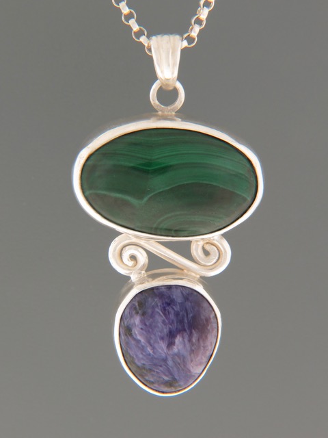 A Sterling Silver pendant with an oval Malachite cabochon and a teardrop Charoite cabochon featuring a double spiral design.