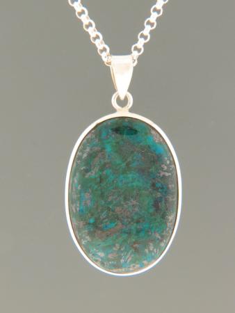 This Sterling Silver pendant features an oval shaped Chrysocolla cabochon with green Malachite inclusions.
