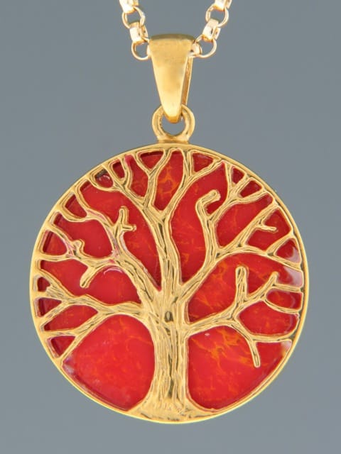 This Gold Vermeilpendant features a round Red Coral disc set in a “Tree of Life” design. Pendant is reversible to show Coral only.