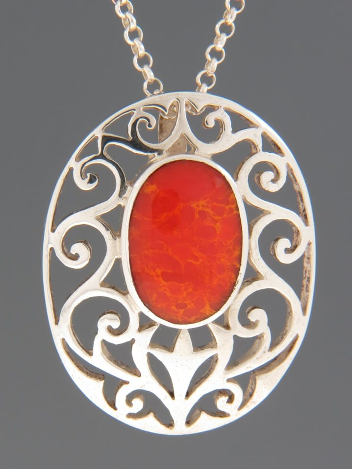 This Sterling Silver pendant features an oval Red Coral cabochon.