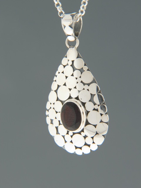 This Sterling Silver pendant features an oval faceted Garnet stone.
