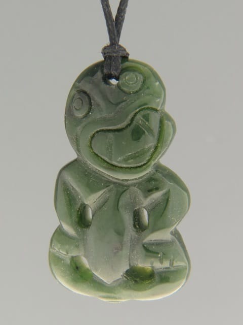 A Jade pendant carved in a traditional New Zealand “hei tiki” design.