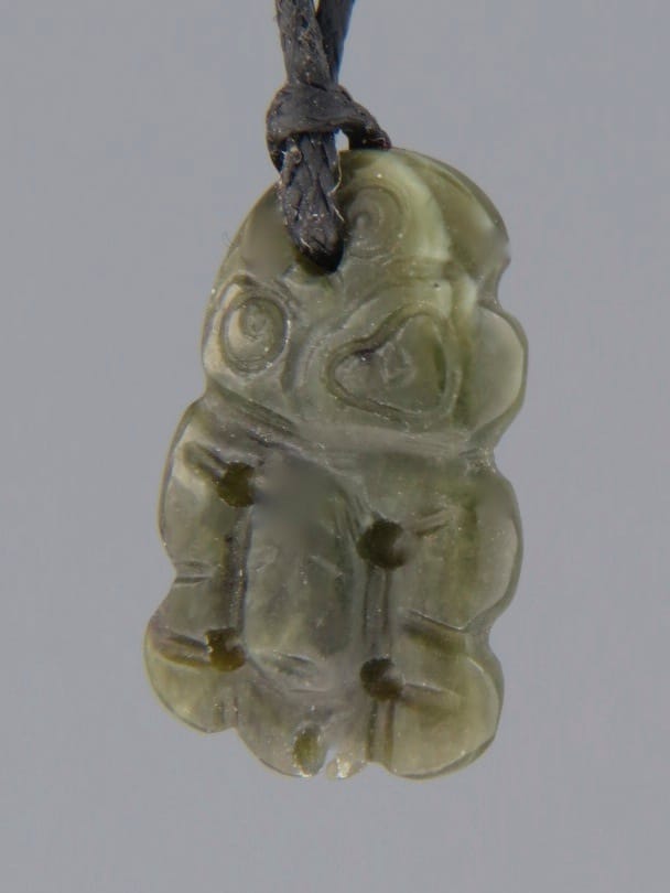 A Jade pendant carved in a traditional New Zealand “hei tiki” design.
