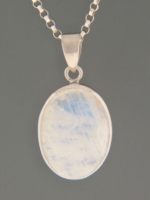 This Sterling Silver pendant features an oval Blue Moonstone cabochon.