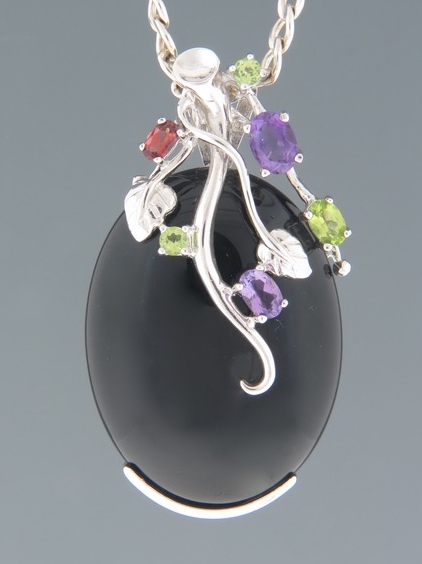 This Sterling Silver pendant features an oval Onyx cabochon with faceted Amethyst, Garnet and Peridot accent stones.