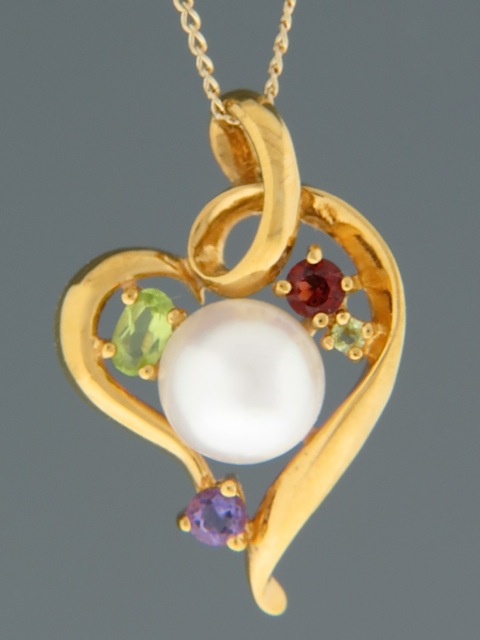 This Gold Vermeilpendant features a white Pacific Pearl with faceted Peridot, Garnet and Amethyst accent stones.