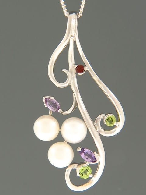 This Sterling Silver pendant features white Pacific Pearls with faceted Garnet, Amethyst and Peridot accent stones.