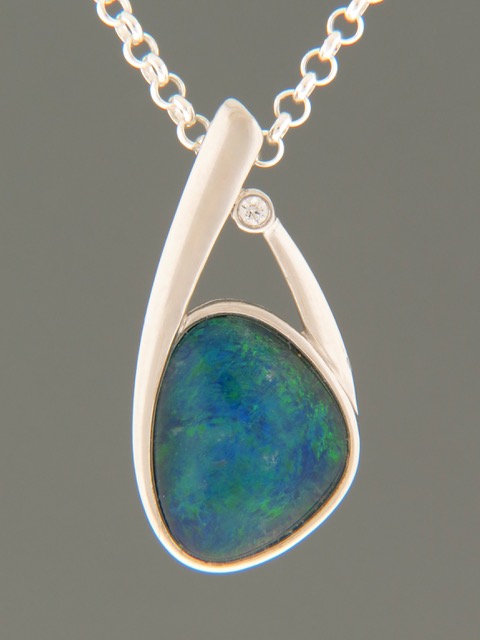 This Sterling Silver pendant features a Boulder Opal triplet cabochon with a dark blue base colour and shows vibrant green opalescence with a hint of yellow and pink with a natural Zircon accent stone.