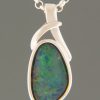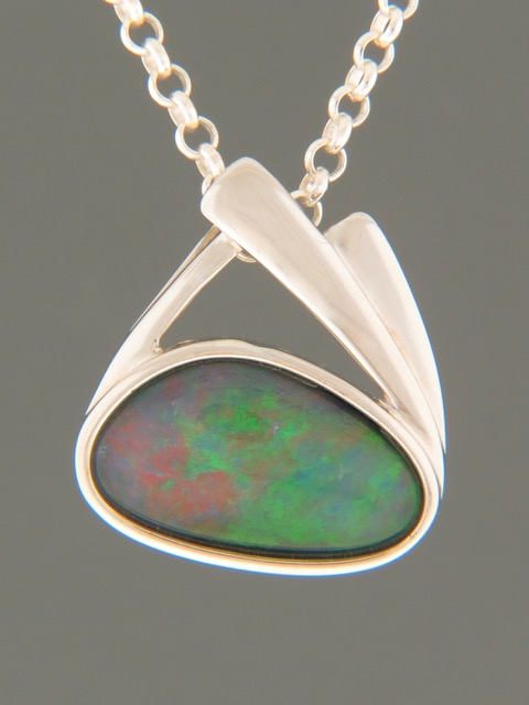 This Sterling Silver pendant features a Boulder Opal triplet cabochon with a dark blue base colour and shows vibrant pink, orange, gold and green opalescence.