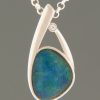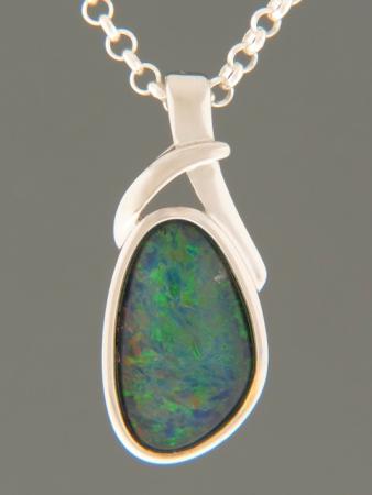 This Sterling Silver pendant features a Boulder Opal triplet cabochon with a dark blue base colour and shows vibrant green, orange and yellow/gold opalescence with a hint of pink.