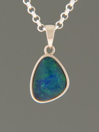 This Sterling Silver pendant features a Boulder Opal triplet cabochon with a dark blue base colour and shows vibrant green opalescence.