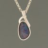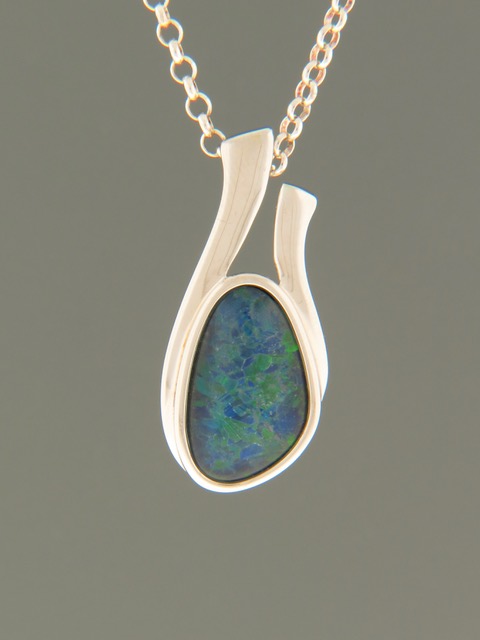 This Sterling Silver pendant features a Boulder Opal triplet cabochon with a dark blue base colour and shows vibrant green and blue opalescence.