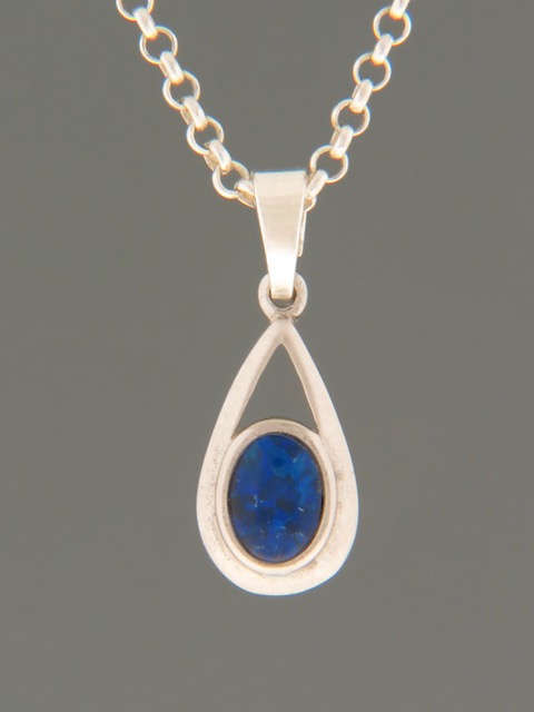 This Sterling Silver pendant features an oval shaped Boulder Opal triplet stone with a dark blue base colour and lighter blue opalescence.