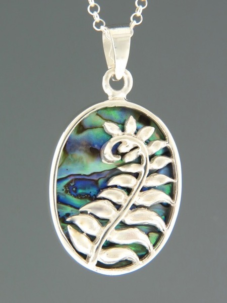 This Sterling Silver pendant features oval New Zealand Paua Shell with a Silver Fern design.