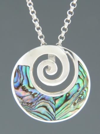 This Sterling Silver pendant features inlaid New Zealand Paua Shell with a spiral design.