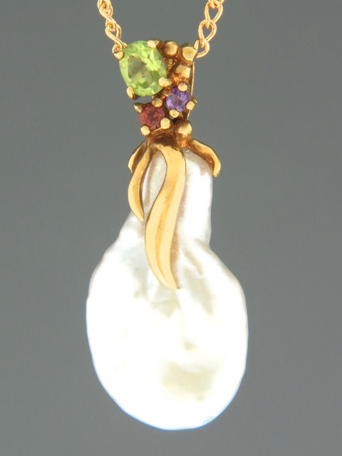 This Gold Vermeilpendant features a Baroque Pacific Pearl with faceted Peridot, Amethyst and Garnet accent stones.