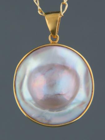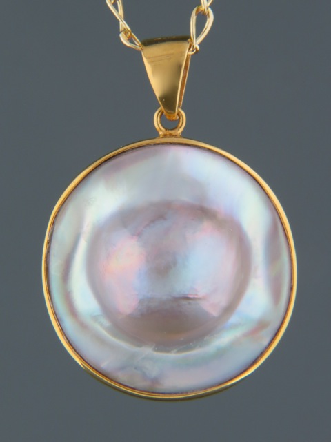 This Gold Vermeilpendant features a Blister Pearl from a Mussel shell. The Pearl has been cut from the shell with a surrounding piece of shell.