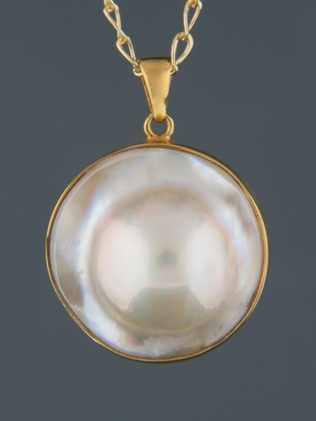 This Gold Vermeilpendant features a blister Pearl from a Mussel Shell. The Pearl has been cut from the shell with a surrounding piece of shell.
