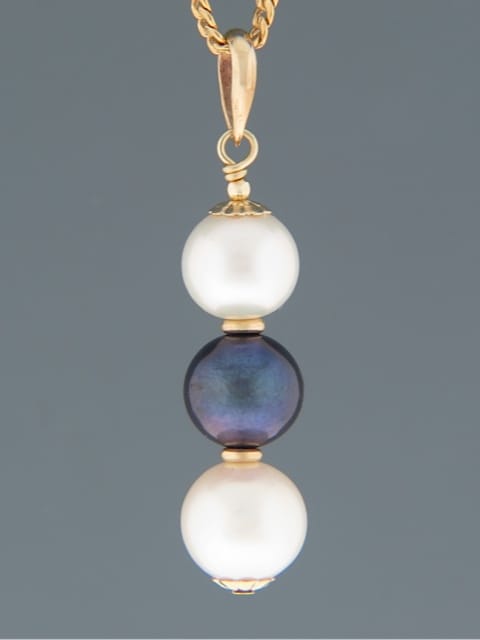 A pendant featuring white and dark Pacific Pearls with Gold Filled fittings.