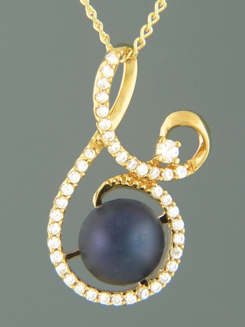 This Gold Vermeilpendant features a dark Pacific Pearl with faceted Zircon accent stones.