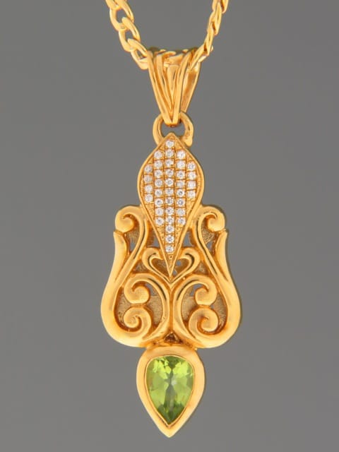 This Gold Vermeilpendant features a teardrop faceted Peridot stone with round faceted Zircon accent stones.