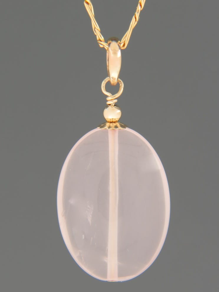 A pendant featuring a smooth polished, oval Rose Quartz stone with 14ct Gold Filled fittings.