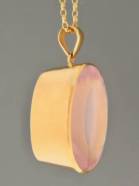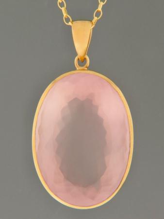 This Gold Vermeilpendant features a large, oval-shaped, faceted Rose Quartz stone.