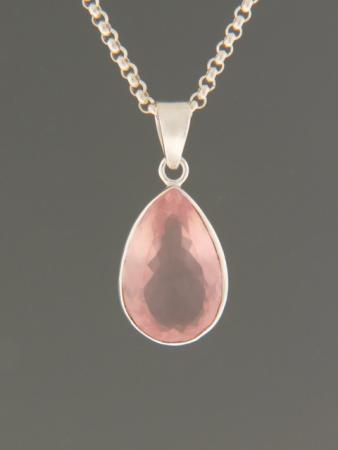 This Sterling Silver pendant features a teardrop shaped, faceted Rose Quartz stone.