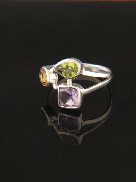 This Sterling Silver ring features faceted Peridot, Amethyst and Citrine stones.