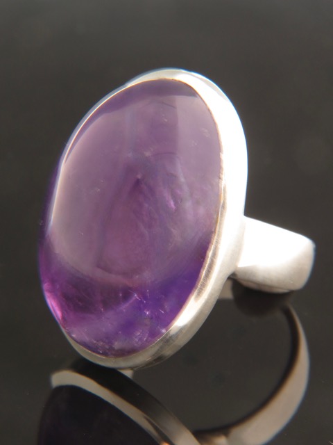 This Sterling Silver ring features a large, oval shaped Amethyst cabochon.