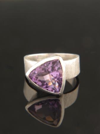 This textured Sterling Silver ring features a faceted, trillion shaped Amethyst stone.