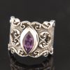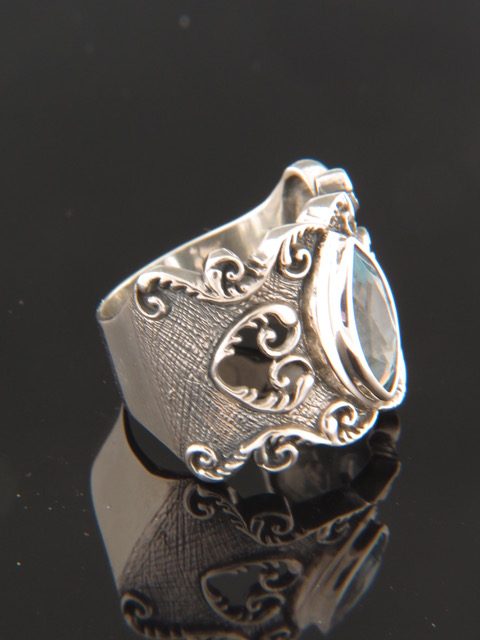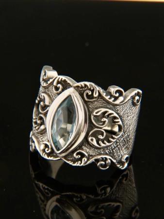 This antiqued Sterling Silver ring features a faceted, marquise-shaped Blue Topaz stone with hand-etching and scrolled heart designs on the shoulders.