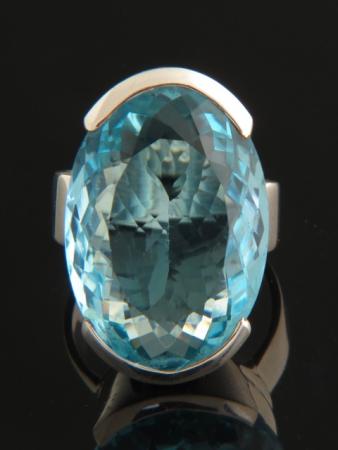 This Sterling Silver ring features a large, oval-shaped, faceted Blue Topaz stone.