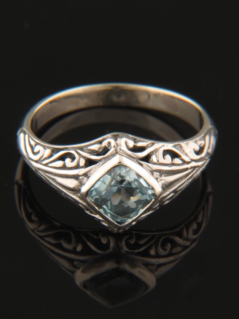 This Sterling Silver ring features a faceted, square shaped Blue Topaz stone with fine filigree detail on the band.