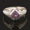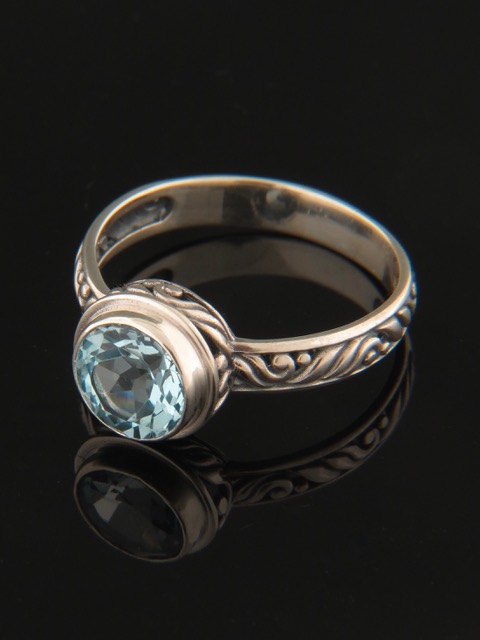 This Sterling Silver ring features a round, faceted Blue Topaz stone with fine filigree detail on the band.