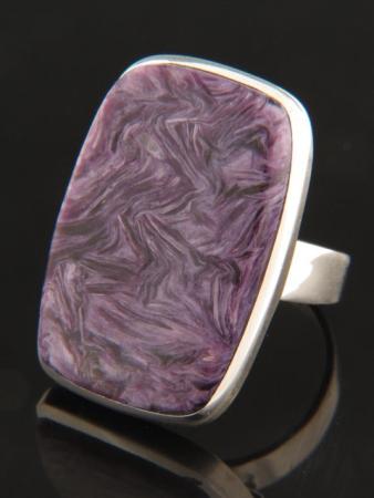 This Sterling Silver ring features a rectangular shaped Charoite cabochon.