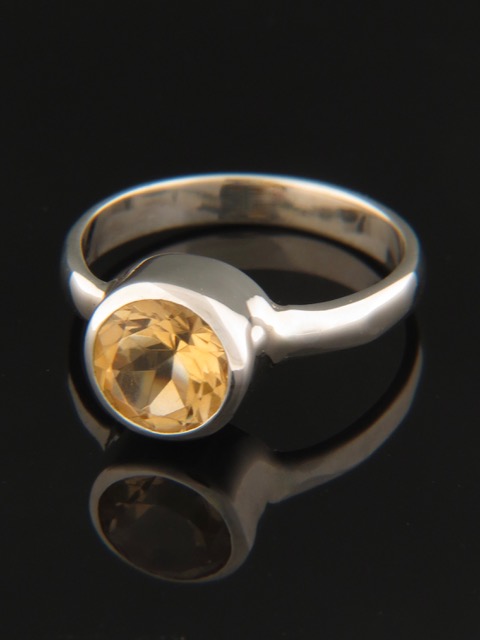 This Sterling Silver ring features a round, faceted Citrine stone.