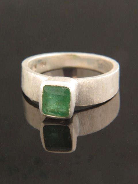 This brushed finish Sterling Silver ring features a faceted, rectangular shaped natural Emerald stone.