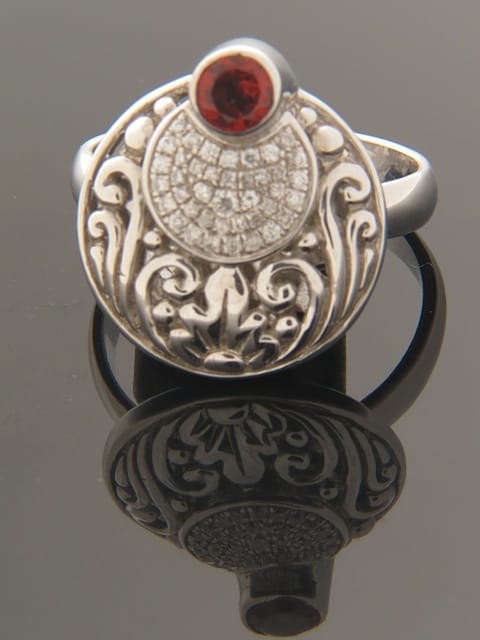 This Sterling Silver ring features a round faceted Garnet with round faceted micro-Zircon stones.