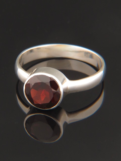 This Sterling Silver ring features a round, faceted Garnet stone.