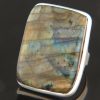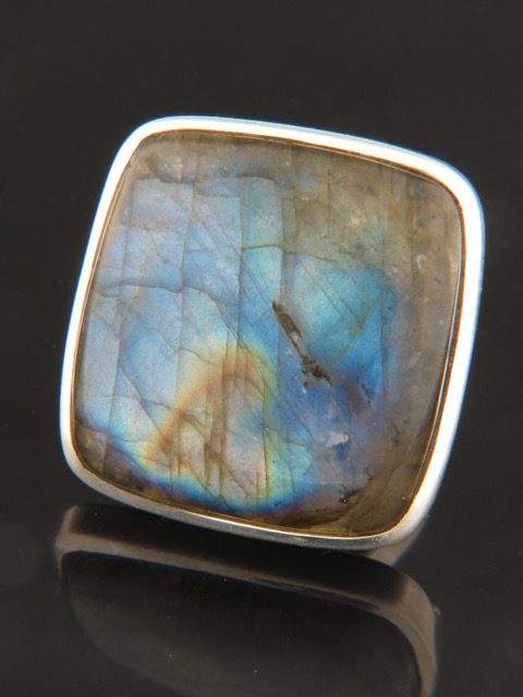 This Sterling Silver ring features a square shaped Labradorite cabochon showing vibrant blue/purple and orange/gold colours with a hint of green.