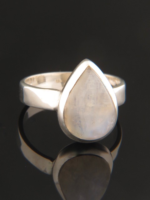 This Sterling Silver ring features a teardrop shaped Moonstone cabochon showing soft blue colour.