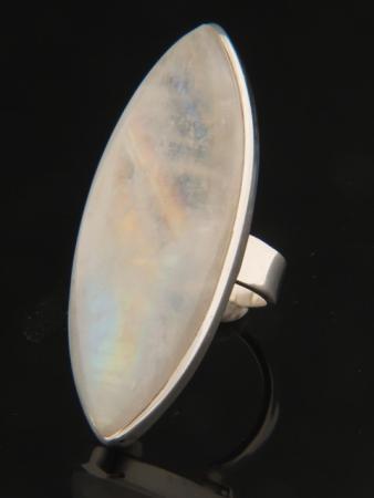 This Sterling Silver ring features a large, marquise shaped Moonstone cabochon showing soft blue, green and rosy gold colours.