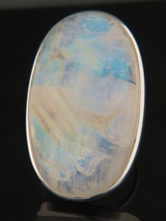 This Sterling Silver ring features a large, oval shaped Moonstone cabochon showing soft blue, green and orange/gold colours.