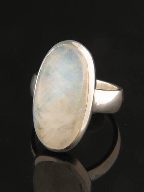 This Sterling Silver ring features an oval shaped Moonstone cabochon showing soft green and gold colours.
