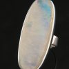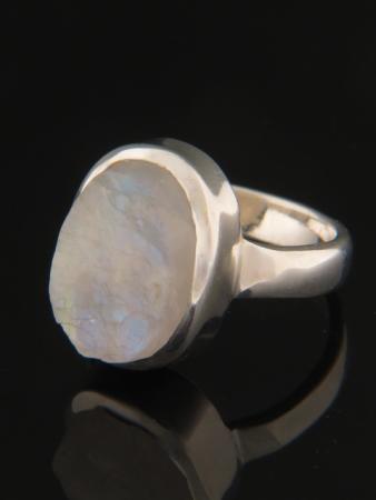 This Sterling Silver ring features an oval shaped, raw, uncut Moonstone showing soft blue and green colours.