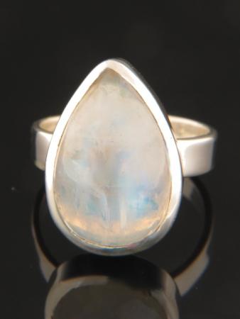 This Sterling Silver ring features a teardrop shaped Moonstone cabochon showing soft green and blue colours.