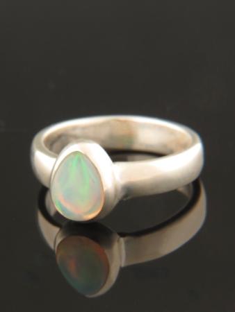 This Sterling Silver ring features a solid, teardrop shaped White Ethiopian Welo Opal cabochonshowing soft orange/pink, yellow and green colours.